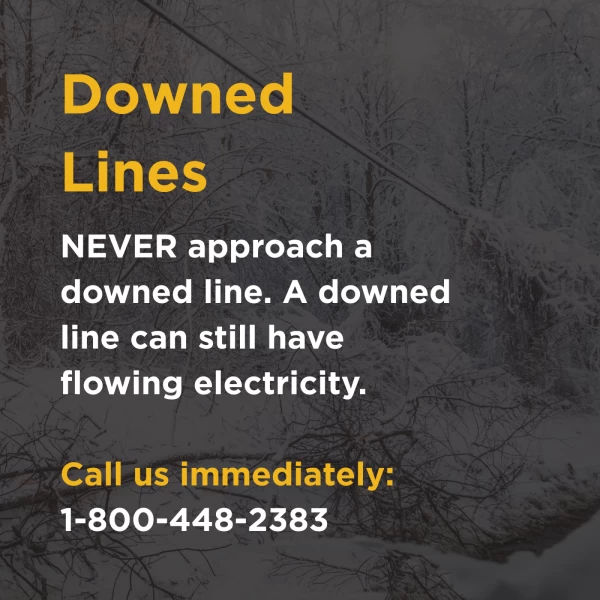 High winds can impact trees outside the rights of way falling into power lines. Downed power lines can still be energized and therefore dangerous or even deadly! If you see a downed line, never touch it or go near it! You should also stay far away from objects in contact with a downed line. Report them immediately to Blue Ridge Energy at 1-800-451-5474 and notify 911.