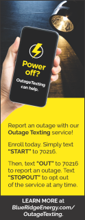 If outages occur, report them by calling 1-800-448-2383, using the Blue Ridge mobile app or over the cooperative’s outage texting service. To sign up for outage texting, use a mobile phone number on your Blue Ridge Energy account and text START to 70216.